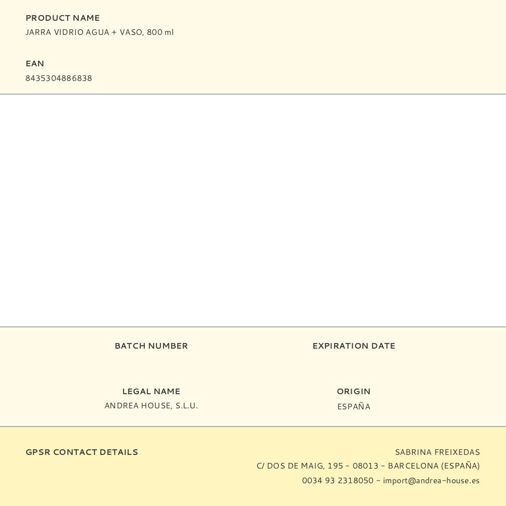 JARRA VIDRIO CON VASO DE AGUA. CAPACIDAD 800 ml BOTELLA Ø 9 x 22 cm VASO Ø 6,5 x 8 cm