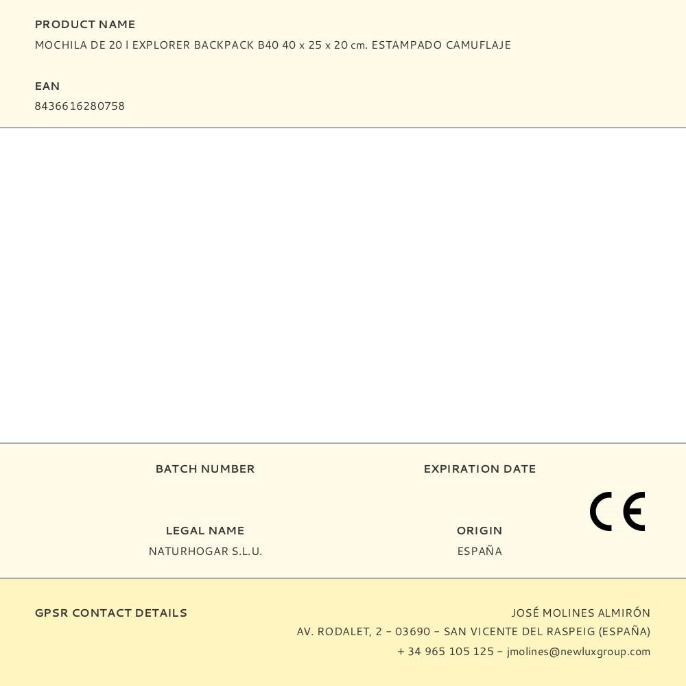 MOCHILA DE 20 l EXPLORER BACKPACK B40 40 x 25 x 20 cm. ESTAMPADO CAMUFLAJE