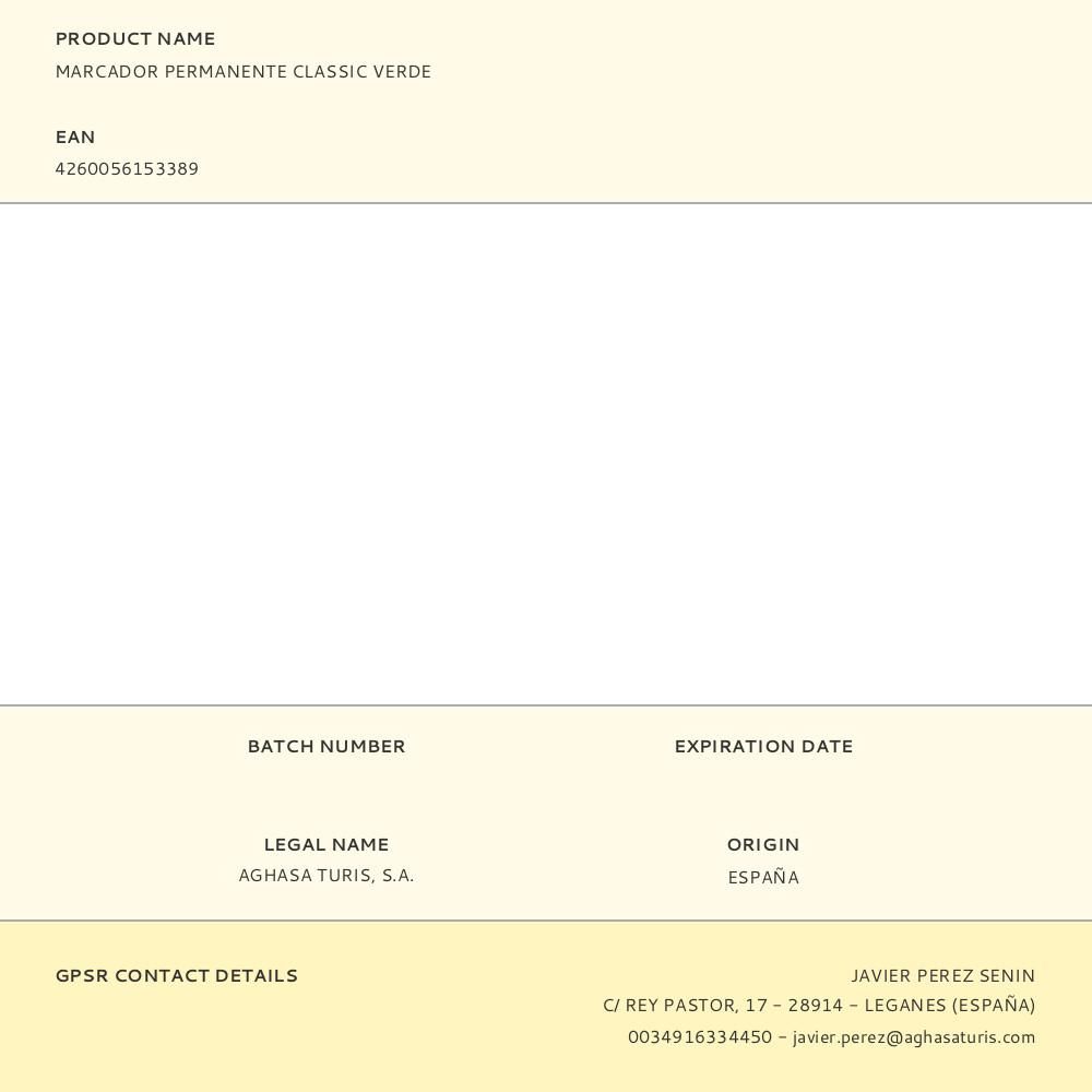 MARCADOR PERMANENTE CLASSIC VERDE, PARA MARCAJE PERMANENTE EN CASI TODO TIPO DE SUPERFICIES. MARCAJE DE COLOR ALTAMENTE OPACO PARA UN GRAN CONTRASTE. EXTREMADAMENTE VISIBLE CON LA LUZ. INCLUSO PARA USO EN EXTERIORES. SECADO RÁPIDO. DIFÍCIL DE QUITAR. LIBRE DE TOLUENO Y XILENO