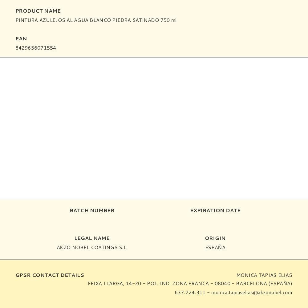 PINTURA AZULEJOS (PARED) AL AGUA SATINADO BLANCO PIEDRA 750 ml FÁCIL APLICACIÓN. ACABADO DE GRAN DUREZA, RESISTENTE A LAS CONDICIONES ESPECIALES PROPIAS DE COCINAS Y BAÑOS. RESISTENTE A PRODUCTOS DE LIMPIEZA, SIN OLOR, NO AMARILLEA, 2 EN 1 IMPRIMACIÓN Y ACABADO, SECADO RÁPIDO. PARA INTERIOR. NO APTO PARA INMERSIÓN, NI ZONAS CON CONDENSACIÓN CONSTANTE. NO UTILIZAR PARA BALDOSAS DE SUELO NI ENCIMERAS, RENDIMIENTO APROXIMADO 7,5 m², SECADO EN 1-1,5 h