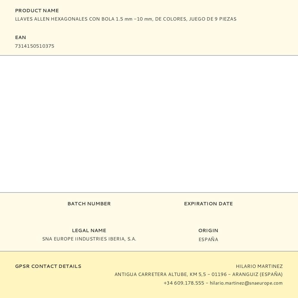 LLAVES ALLEN HEXAGONALES CON BOLA 1.5 mm -10 mm, DE COLORES, JUEGO DE 9 PIEZAS