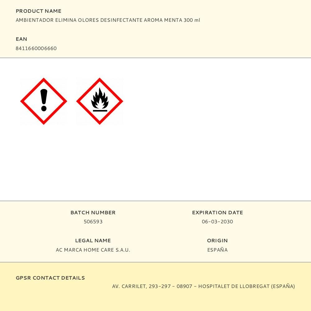 AMBIENTADOR ELIMINA OLORES DESINFECTANTE AROMA MENTA 300 ml