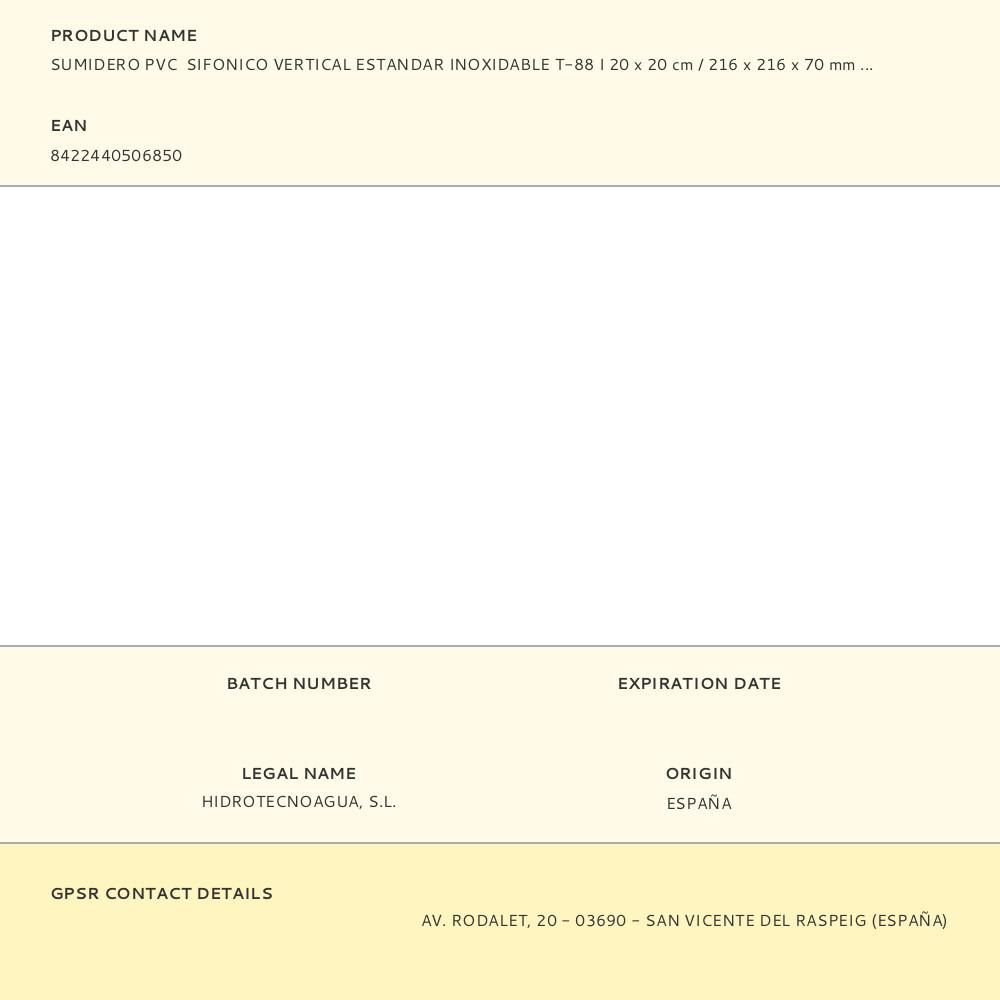 SUMIDERO PVC SIFONICO VERTICAL ESTANDAR INOXIDABLE T-88 I 20 x 20 cm / 216 x 216 x 70 mm / Ø110 - 90 mm