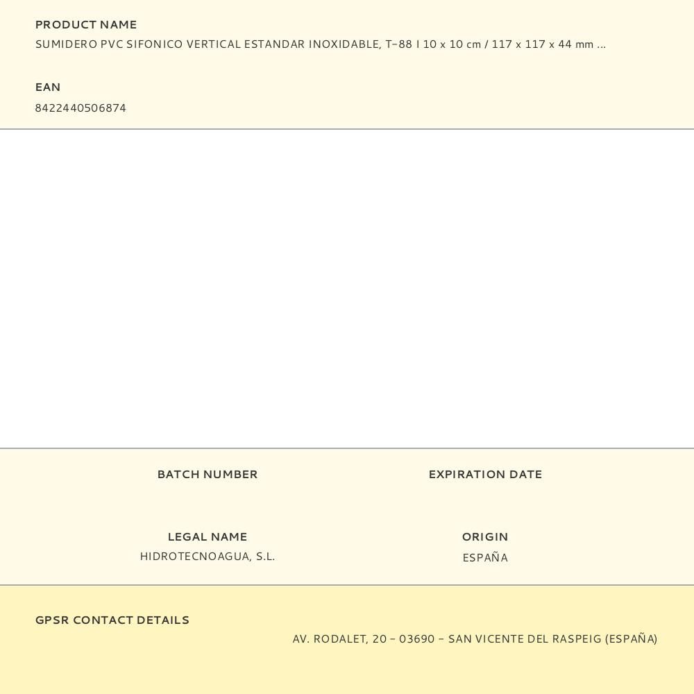 SUMIDERO PVC SIFONICO VERTICAL ESTANDAR INOXIDABLE, T-88 I 10 x 10 cm. 117 x 117 x 44 mm / Ø40 mm