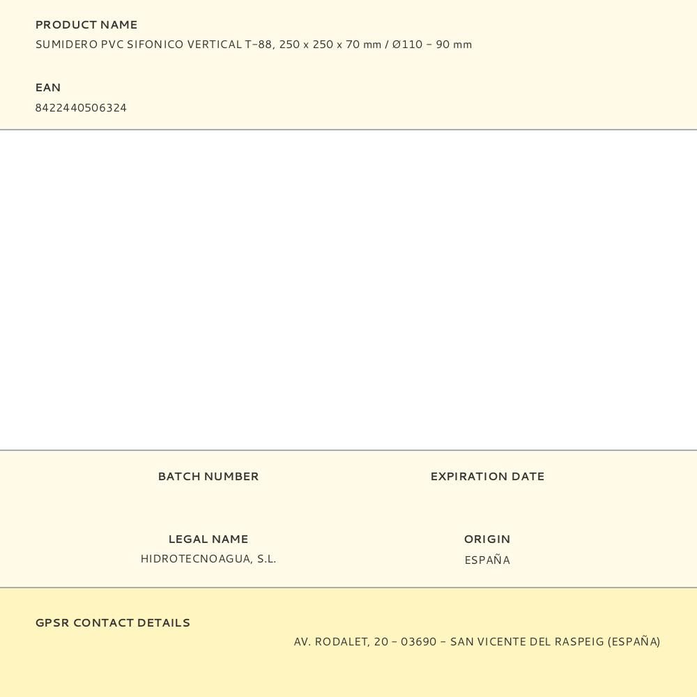 SUMIDERO PVC SIFONICO VERTICAL T-88, 250 x 250 x 70 mm / Ø110 - 90 mm