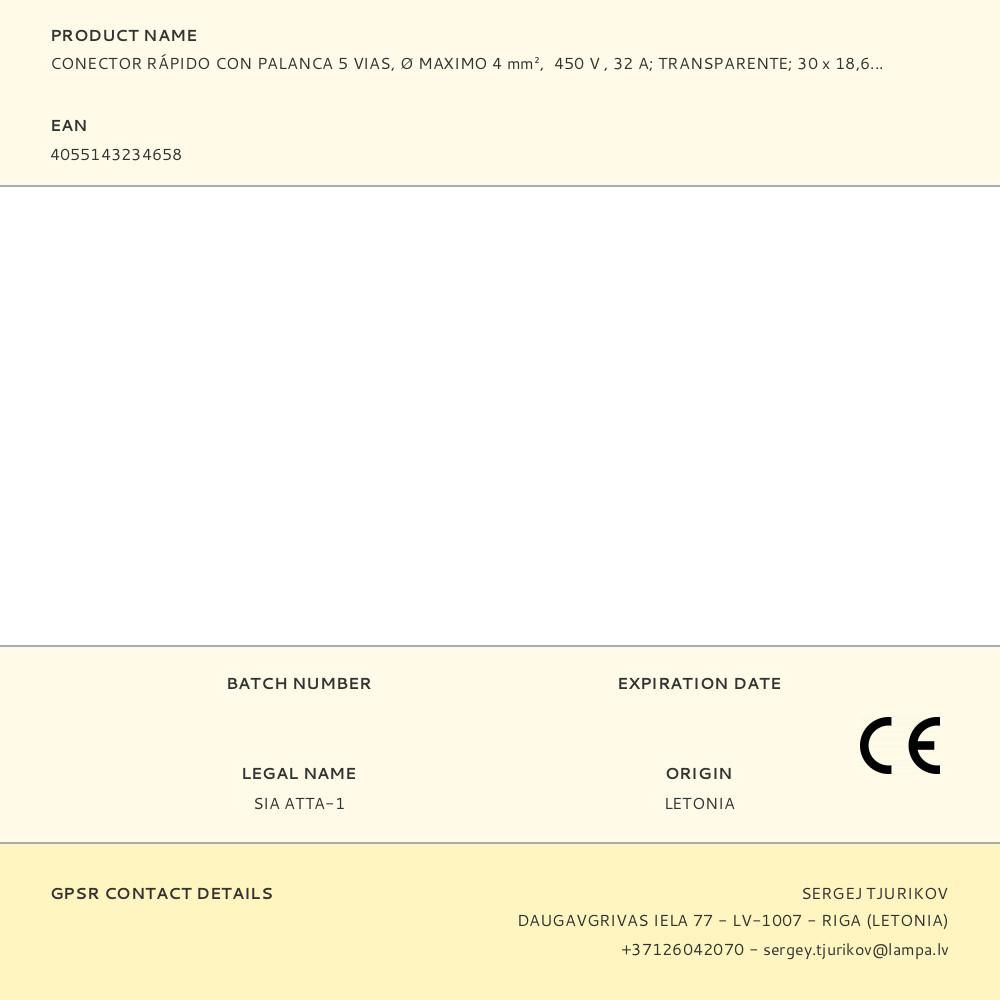 CONECTOR RÁPIDO CON PALANCA, PARA 5 CONDUCTORES RÍGIDOS, SEMIRÍGIDOS O FLEXIBLES DE COBRE, DIÁMETRO ENTRE 0,14 A 4 mm², 450 V, 32 A - TEMPERATURA MAXIMA 85°C - POLICARBONATO TRANSPARENTE - 30 x 18,6 x 8,4 mm