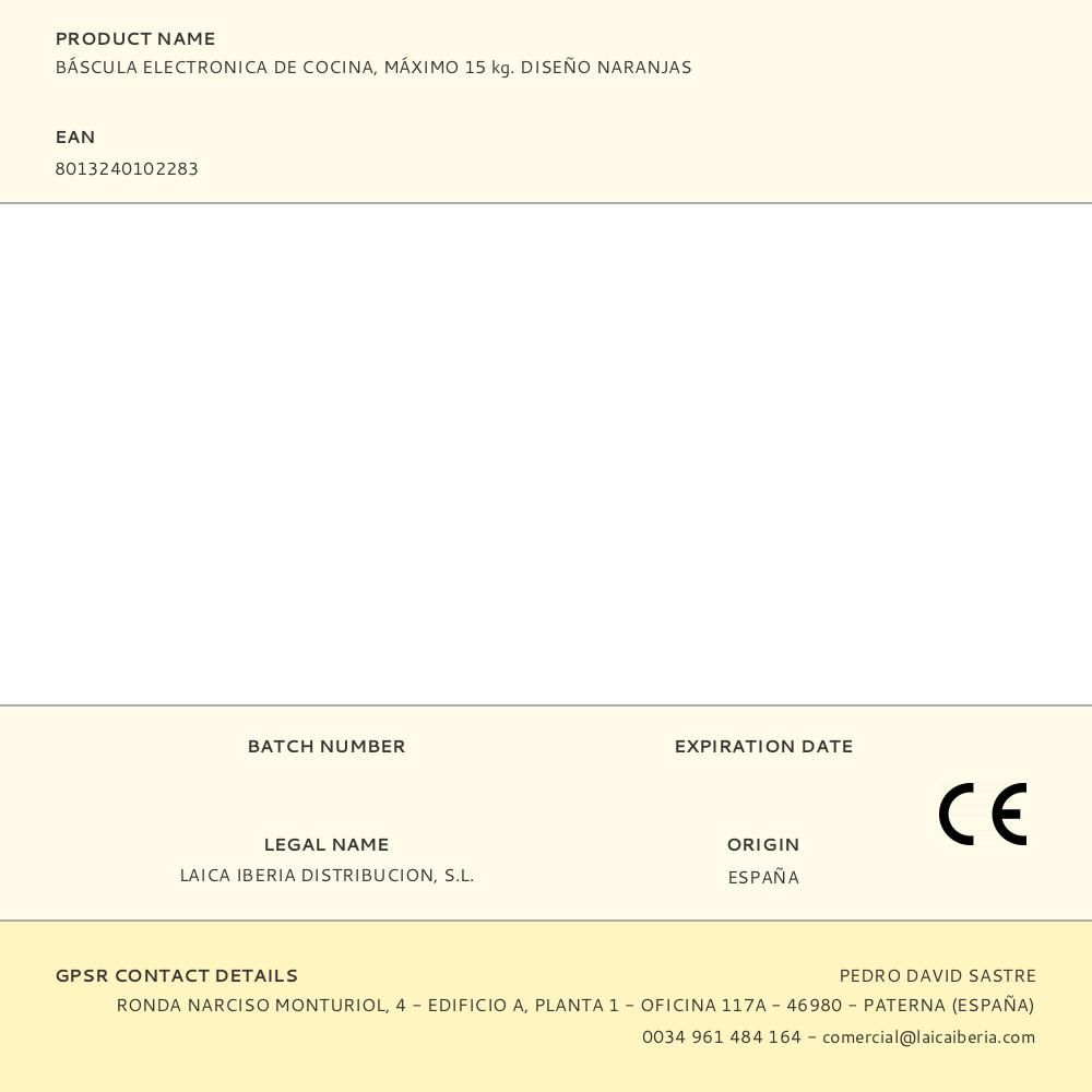 BÁSCULA ELECTRONICA DE COCINA, MÁXIMO 15 kg. DISEÑO NARANJAS. PANTALLA LCD 6,1 x 2,8 cm, MATERIAL VIDRIO TEMPLADO 3 mm. TECLAS TOUCH SENSOR. BATERIA DE LITIO 2 x CR2032 3 V (INCLUIDAS). TEMPERATURA +10ºC +40ºC. HUMEDAD =85%. 22,3 x 18,4 x 1,7 cm