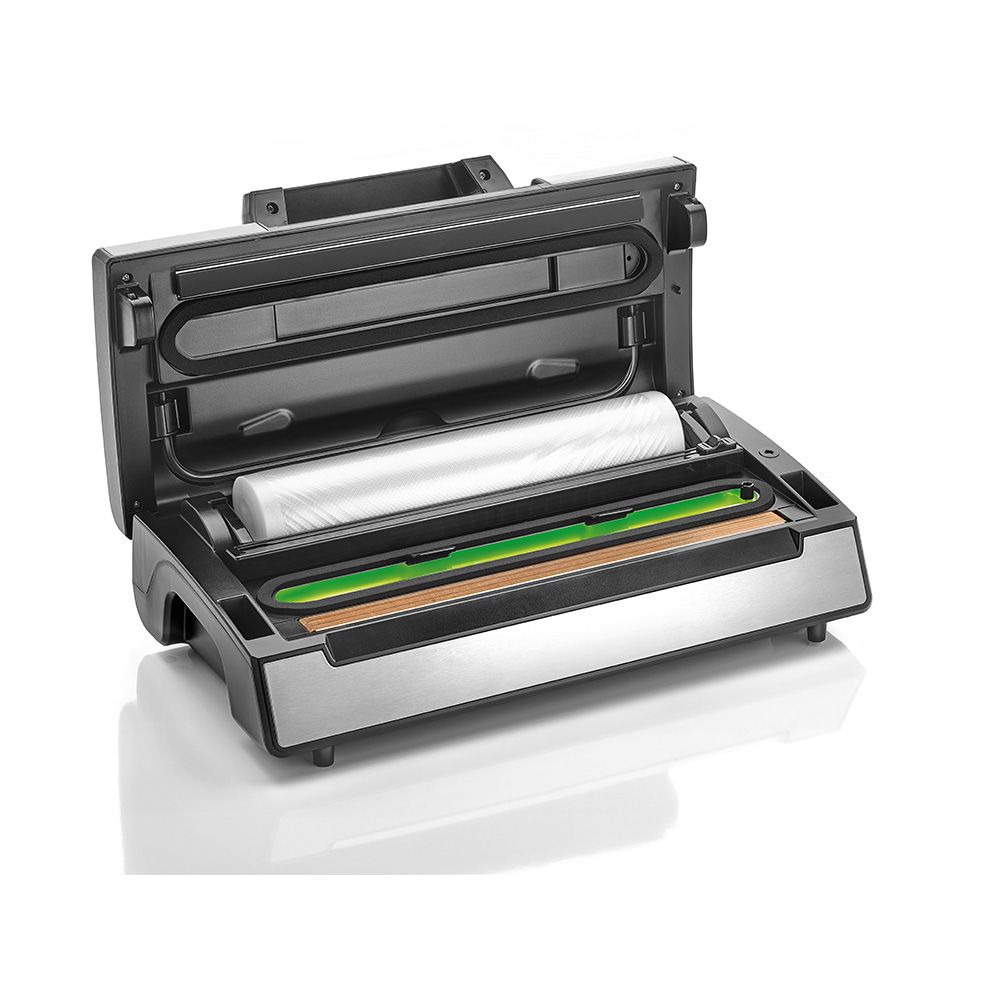 MÁQUINA DE ENVASADO AL VACÍO 20 l/min, COLOR METAL / NEGRO. 220-240 V 50Hz-130 W. CONTIENE DOBLE BARRA DE SELLADO, POTENCIA DE ASPIRACIÓN REGULABLE (NORMAL-SUAVE), TRIPLE AJUSTE DE SELLADO (FUERTE-MEDIO-ESTÁNDAR), ASPIRACIÓN MANUAL POR IMPULSOS, COMPARTIMENTO PARA ROLLOS CON CORTADOR BIDIRECCIONAL, PRÁCTICO SISTEMA DE CIERRE, FUNCIÓN DE MARINADO RÁPIDO, CONTIENE 2 ROLLOS 28 x 600 cm. NIVEL DE RUIDO <76Db, TEMPERATURA- HUMEDAD +10ºC +40ºC - =85%. FRECUENCIA DE USO 1 CICLO CADA 60 segundos. 40 x 20 x 12 cm