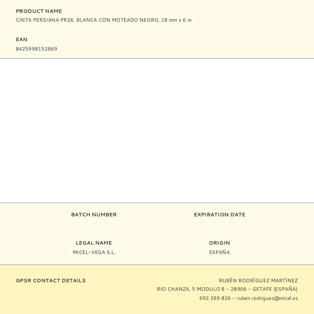 CINTA DE PERSIANA PR26. MATERIAL POLIPROPILENO. ACABADO BLANCO CON MOTEADO NEGRO. MEDIDA 18 mm DE ANCHO Y 6 METROS DE LARGO