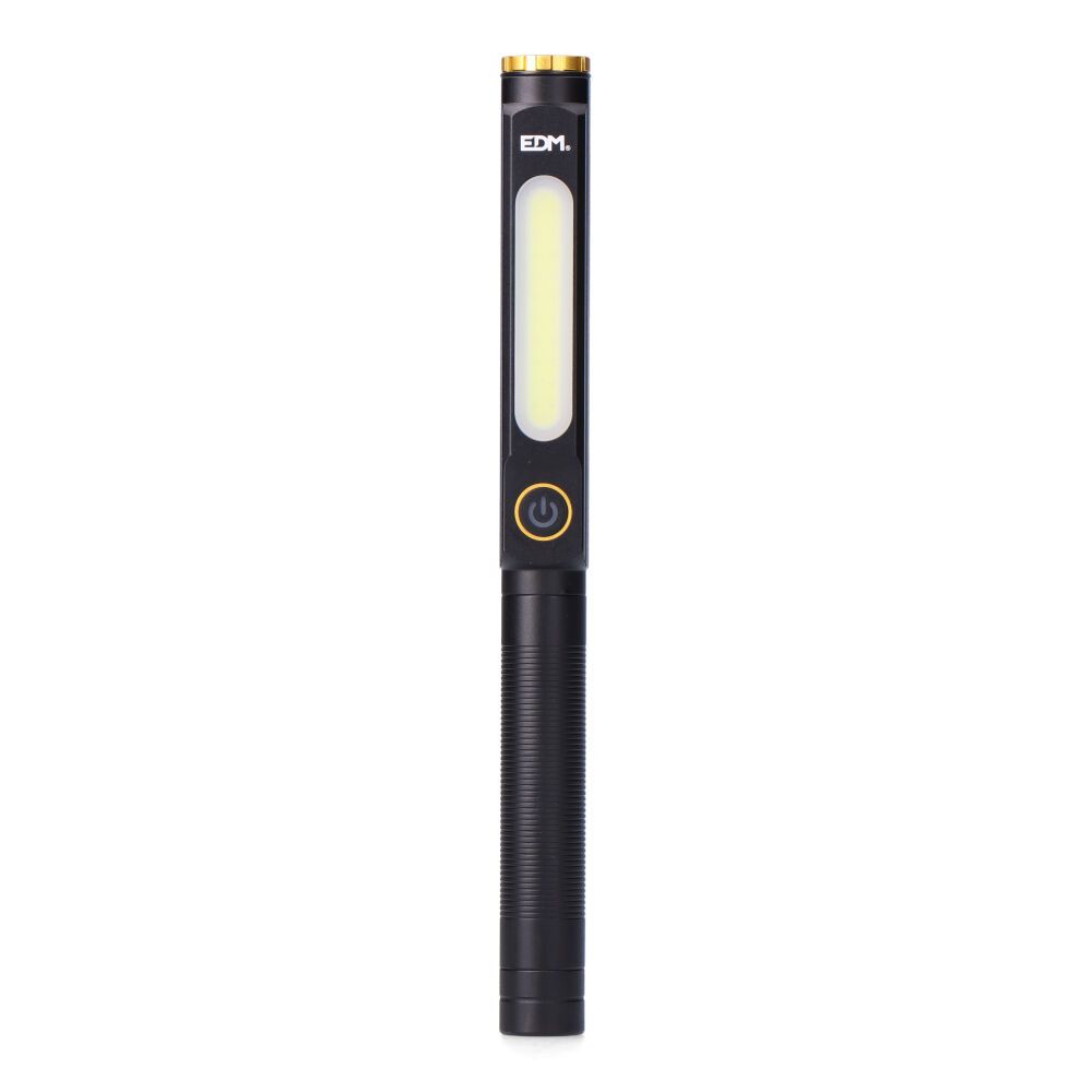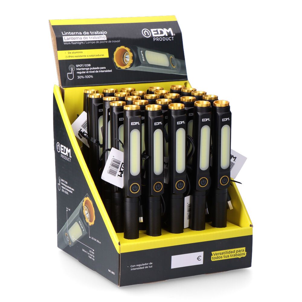 LINTERNA DE TRABAJO DE ALUMINIO, IP44. SPOT LED 5 W, 6500 K, 200 lm. COB LED 8 W, 6500 K CON 3 MODELOS: 500 lm / LUZ ROJA / FLASH ROJO. REGULABLE LA INTENSIDAD SPOT/COB 30% - 100%. BATERIA 750mAh DE LITIO (INCLUIDA), CABLE USB TIPO C (INCLUIDO). HASTA 3 h DE AUTONOMIA APROX, CARGA DE 3 h. CON IMAN EN LA BASE Y CLIP. MEDIDA 18,5 x 25 x 204 mm. PRESENTACION EN EXPOSITOR DE 25 UNIDADES