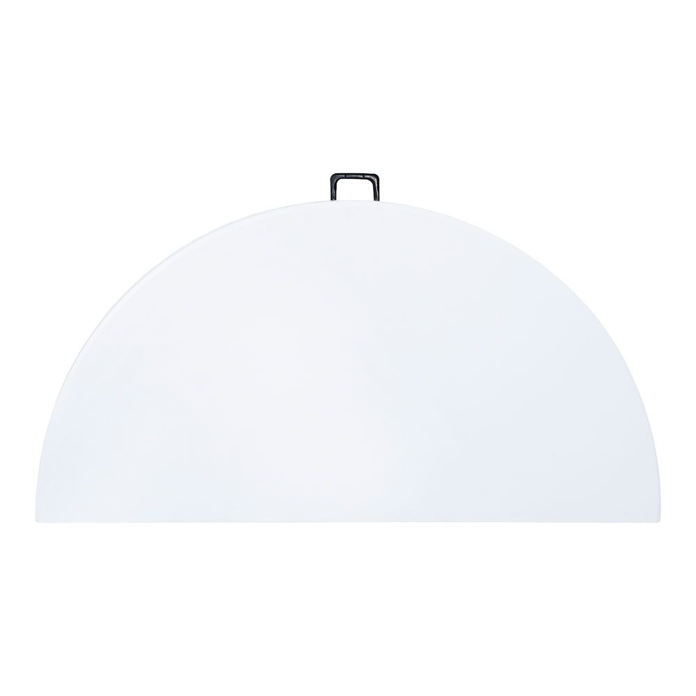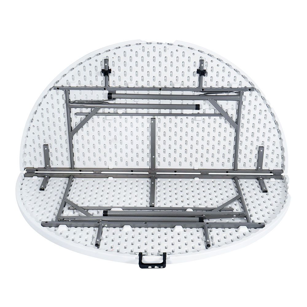 MESA REDONDA PLEGABLE, CARGA MÁXIMA 150 Kg. MATERIAL PLÁSTICO DE ALTA DENSIDAD, TUBO DE ACERO Ø32 mm, MARCO DE ACERO CON ACABADO Y RECUBRIMIENTO. COLOR BLANCO. MEDIDA 180 x 74 cm