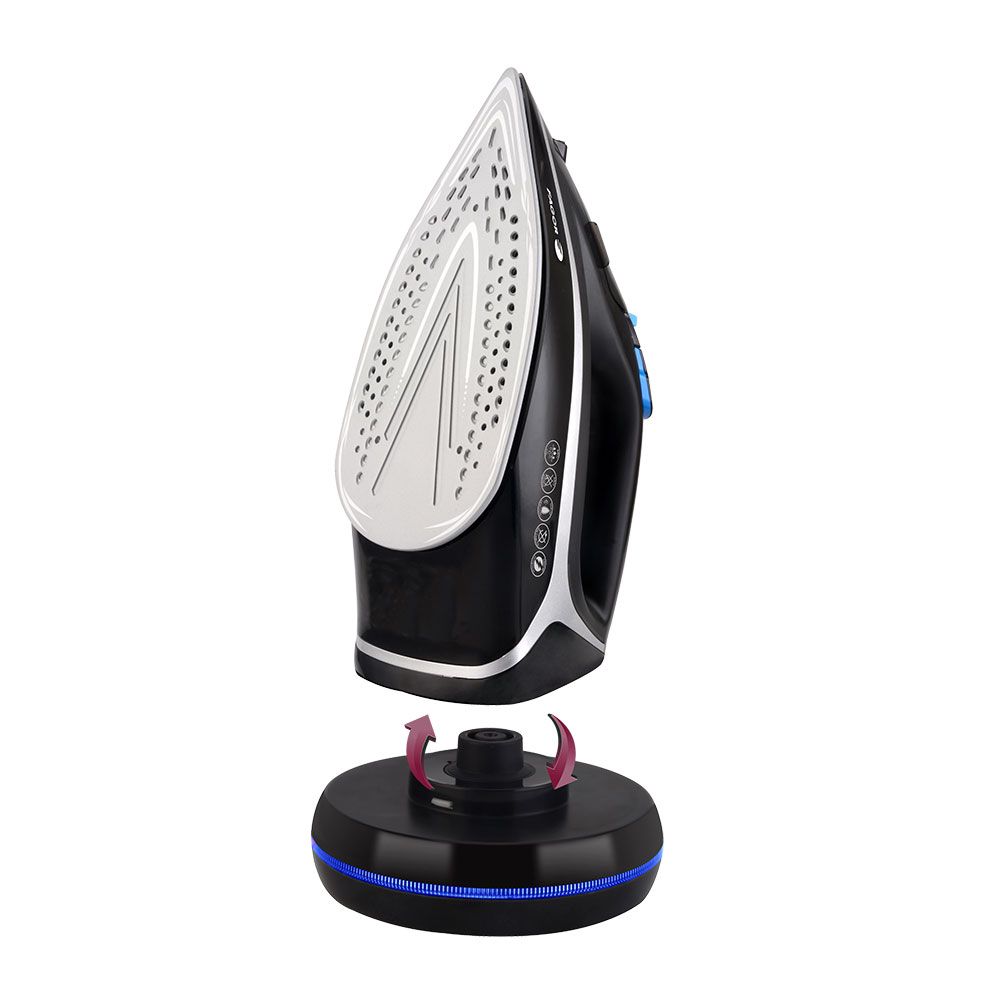 PLANCHA DE VAPOR INALÁMBRICA CON UNA POTENCIA DE 2200 W Y VOLTAJE DE 220-240 V / 50-60 Hz. BASE DE CARGA 360° - FUNCIONES DE VAPOR CONTINUO 25 gr/min, 4 FUNCIONES: PLANCHADO CON VAPOR, PULVERIZACIÓN DE AGUA, EMISIÓN DE VAPOR Y PLANCHADO EN SECO. CON SUELA CERÁMICA PARA UN DESLIZAMIENTO SUAVE. INCLUYE SISTEMA ANTICAL Y ANTIGOTEO, PROGRAMA DE AUTOLIMPIEZA Y TERMOSTATO AJUSTABLE HASTA 230°C. DEPÓSITO DE 300 ml Y VASO MEDIDOR DE 200 ml