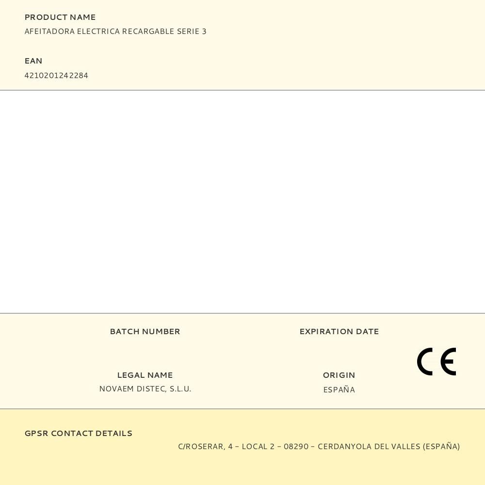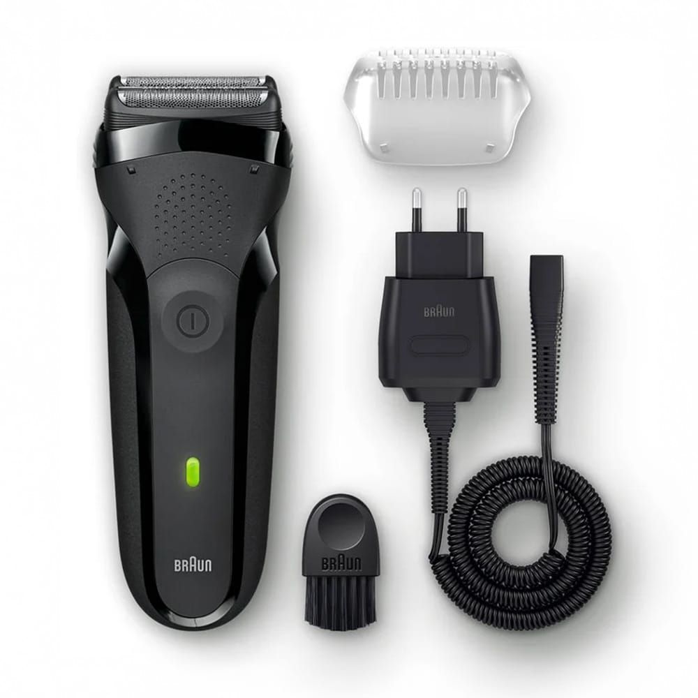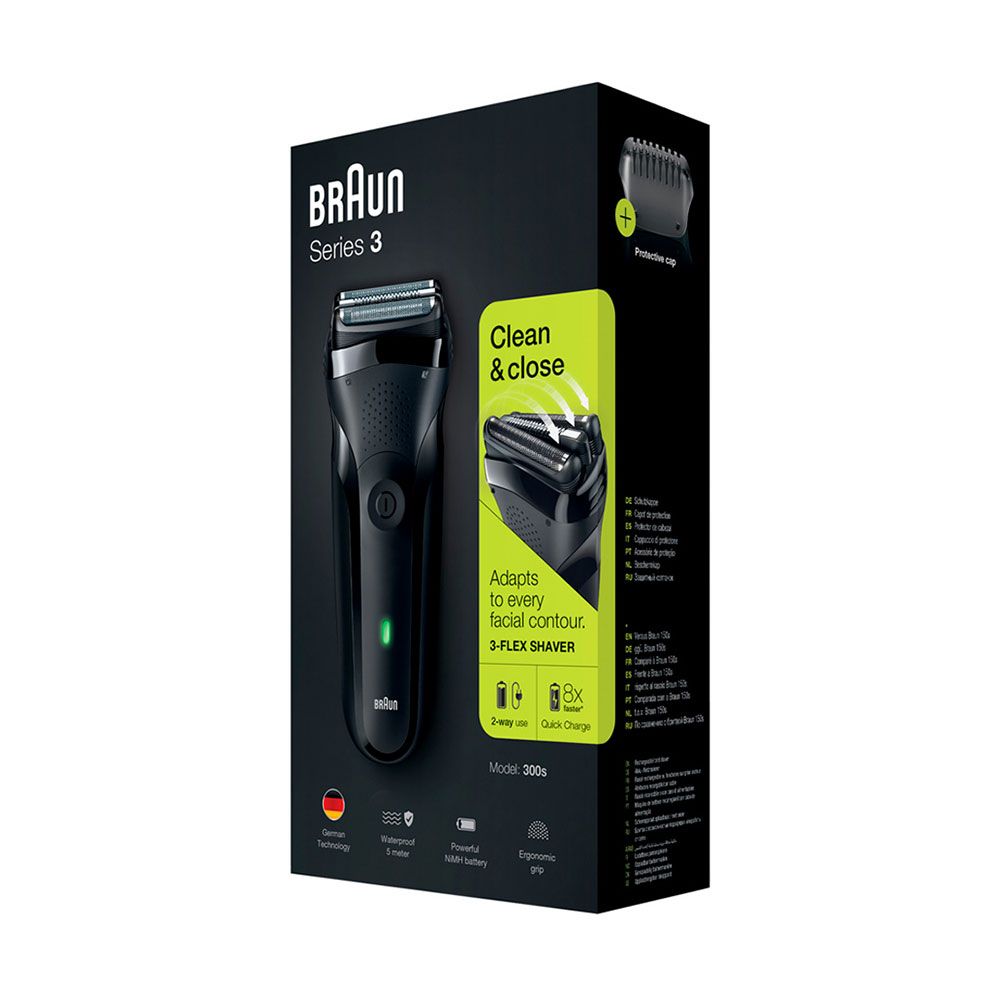 AFEITADORA ELÉCTRICA SERIE 3. CON UNA POTENCIA DE 7 W Y VOLTAJE 100 - 240 V. SISTEMA DE CORTE DE TRIPLE ACCIÓN, EN DOS LÁMINAS Y UNA RECORTADORA INTERMEDIA. CARGA DURANTE 1 h, 20 min DE AFEITADO (APROXIMADO). DISPONE DE UNA CARGA RÁPIDA SI SOLO NECESITARAS 5 min. PUEDES SUMERGIRLA HASTA 5 m DE PROFUNDIDAD