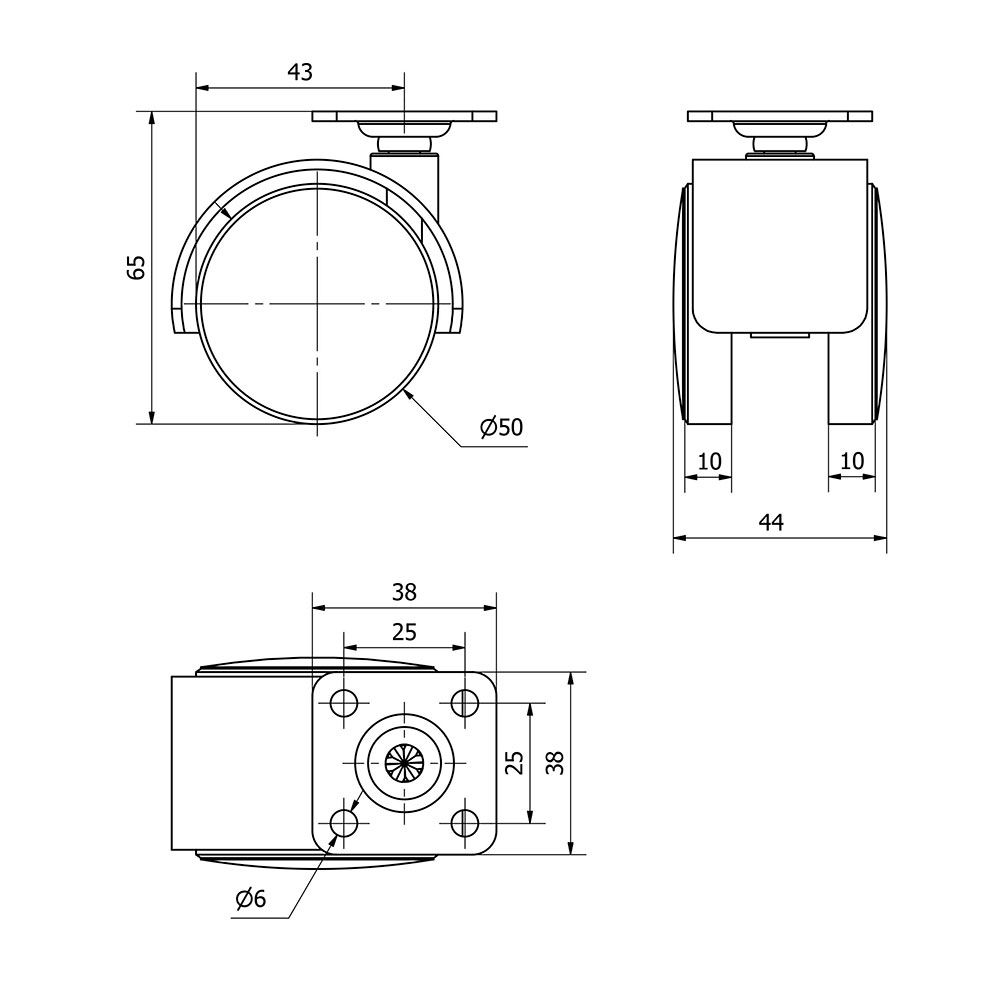 RUEDA GIRATORIA CON PLACA Y EJE LISO, COLOR NEGRO, CARGA MÁX. 50 Kg, Ø 5 cm
