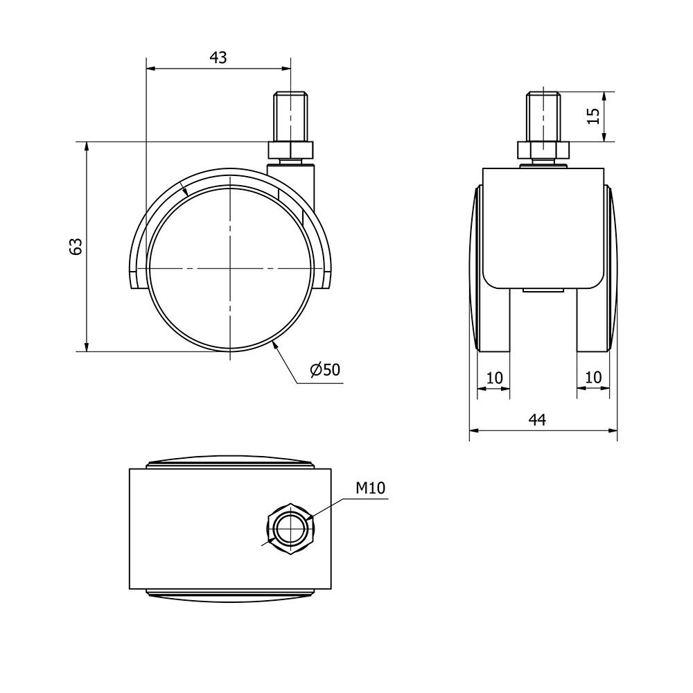 RUEDA GIRATORIA ESPIGA ROSCADA Y EJE LISO, COLOR NEGRO, CARGA MÁX. 50 kg, 10 x 15 cm, Ø 5 cm
