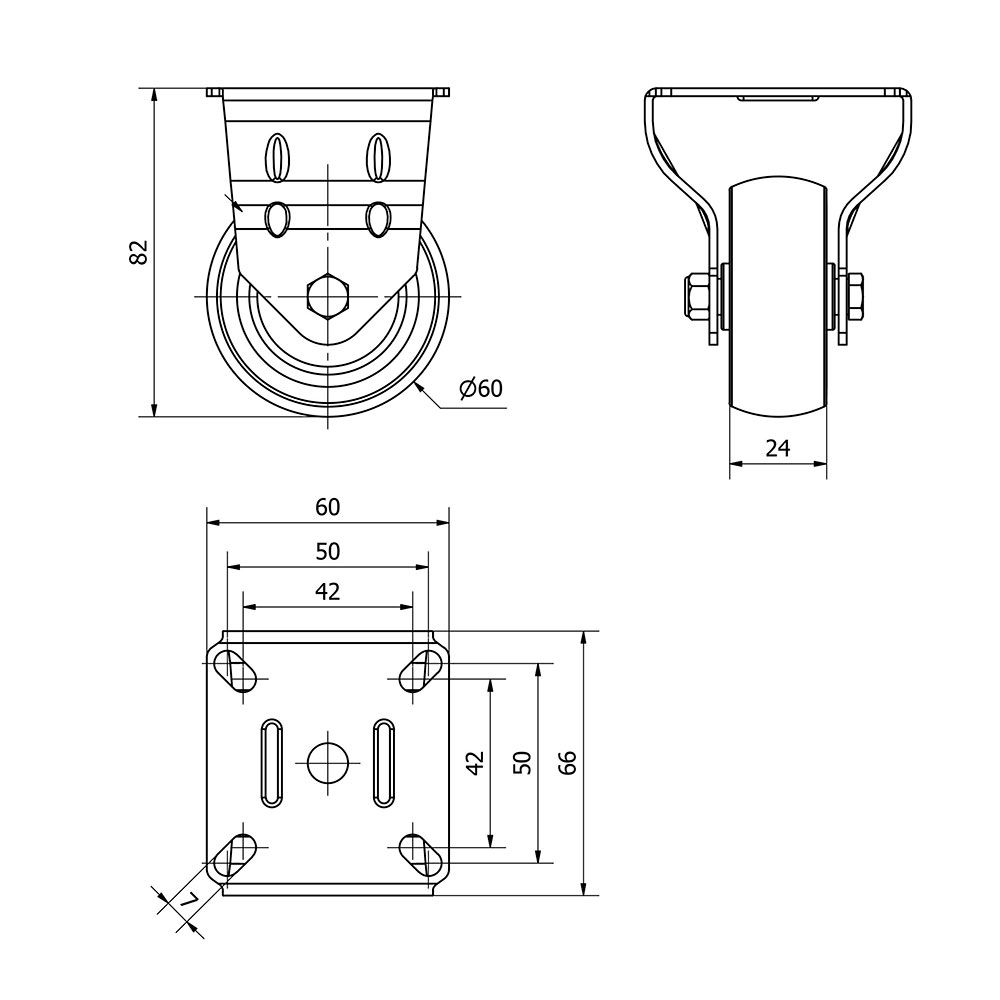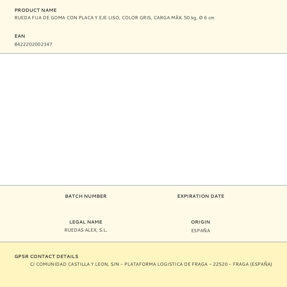 RUEDA FIJA DE GOMA CON PLACA Y EJE LISO, COLOR GRIS, MATERIAL: POLIAMIX - GOMA, CARGA MÁX. 50 kg, Ø 6 cm