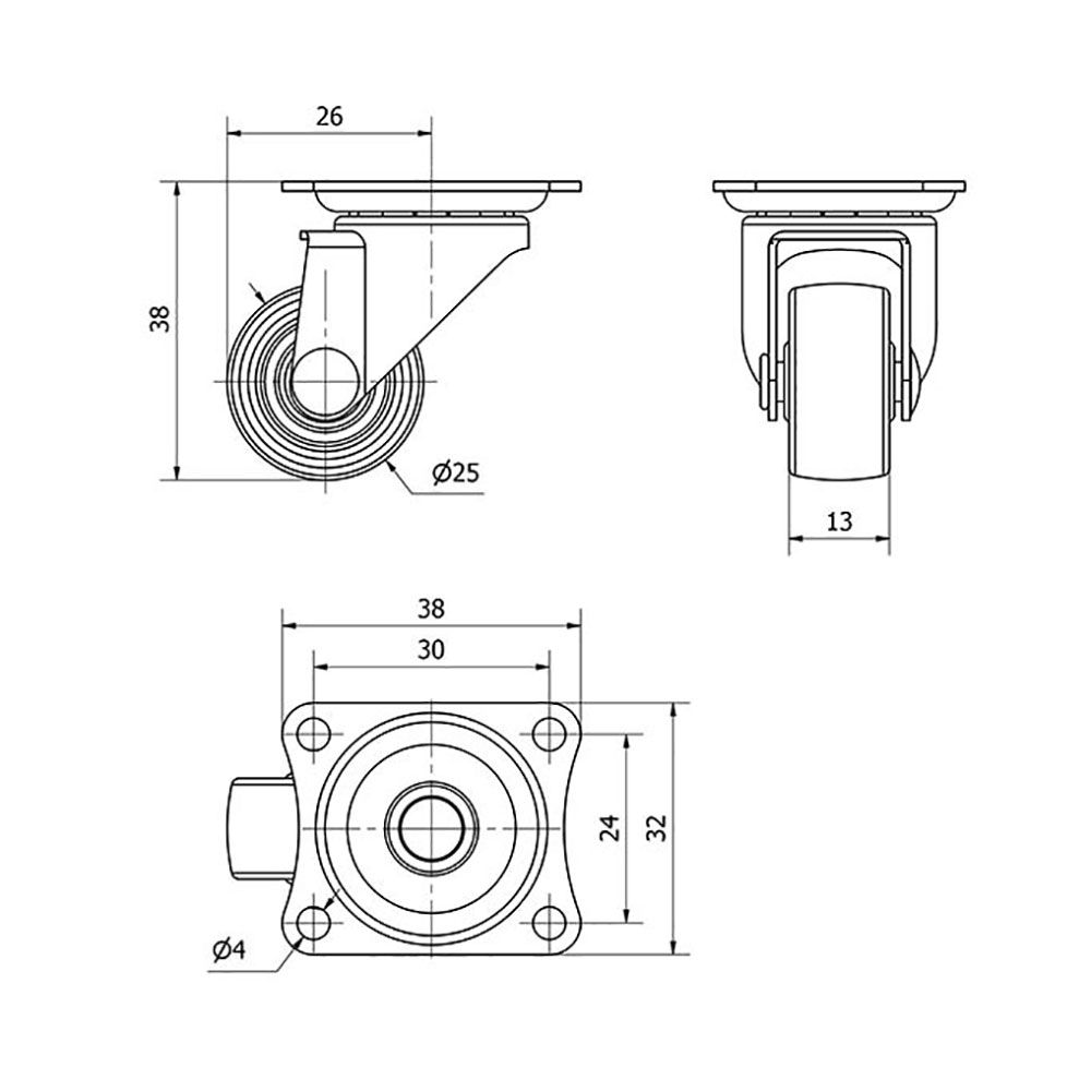 RUEDA GIRATORIA CON PLACA Y EJE LISO, COLOR NEGRO, CARGA MÁX. 10 kg, Ø 2,5 cm