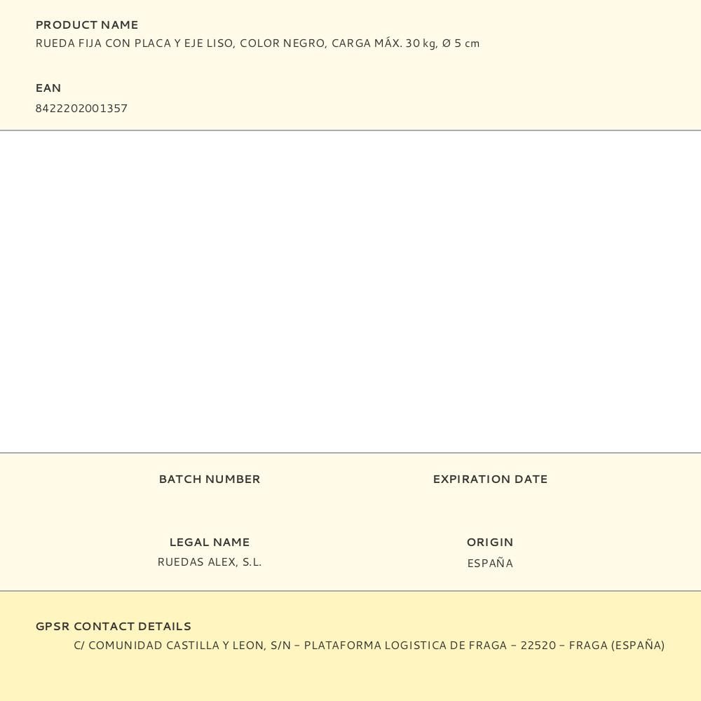 RUEDA FIJA CON PLACA Y EJE LISO, COLOR NEGRO, CARGA MÁX. 30 kg, Ø 5 cm