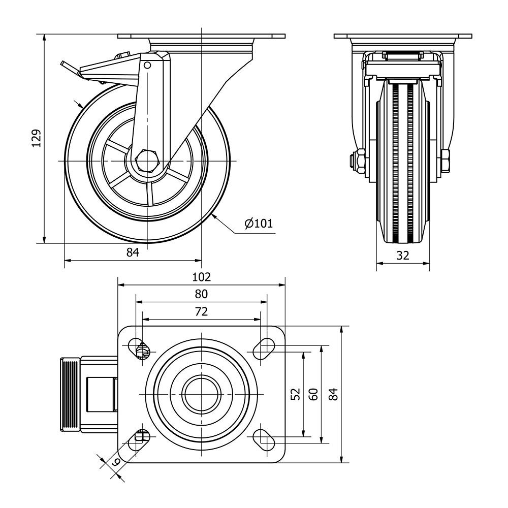 RUEDA GIRATORIA CON PLACA, EJE LISO Y FRENO, COLOR NEGRO, MATERIAL: POLIAMIX - GOMA, CARGA MÁX. 80 kg, Ø 10 cm