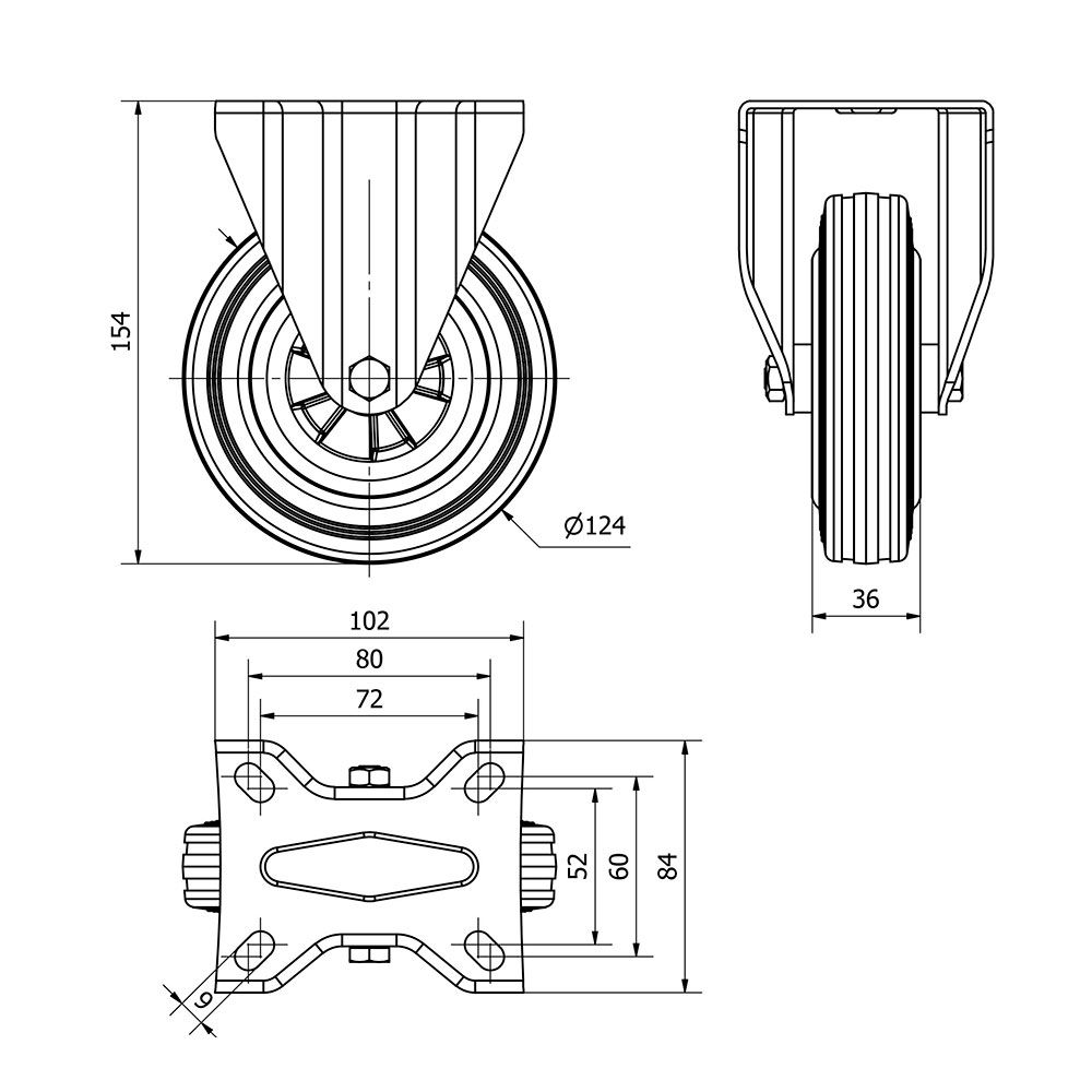 RUEDA FIJA CON PLACA Y EJE LISO, COLOR NEGRO, MATERIAL: POLIAMIX - GOMA, CARGA MÁX. 110 kg, Ø 12,5 cm