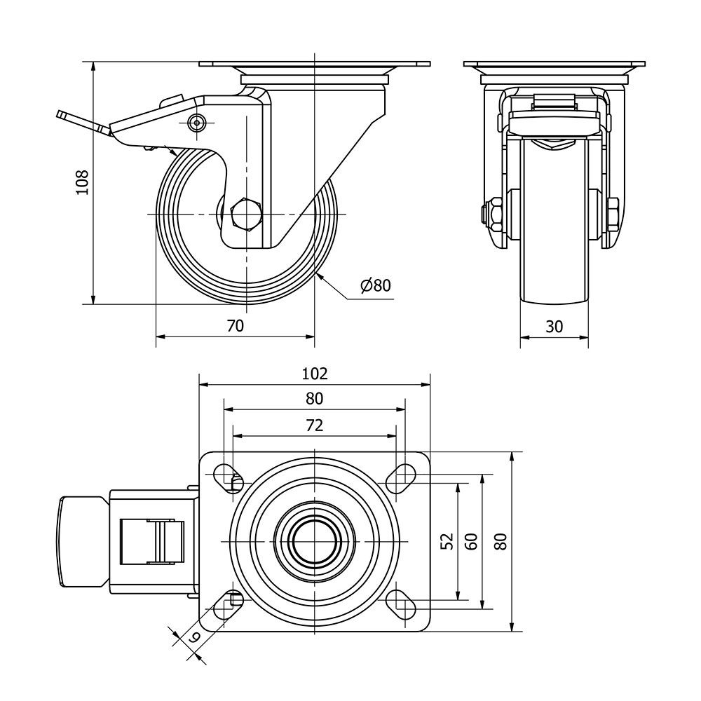 RUEDA GIRATORIA CON PLACA, EJE LISO Y FRENO, COLOR BLANCO, MATERIAL: POLIAMIX, CARGA MÁX. 130 kg, Ø 8 cm