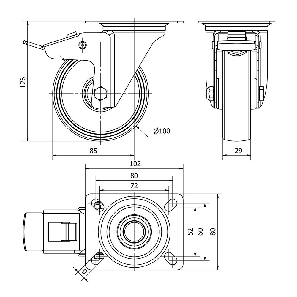 RUEDA GIRATORIA DE POLIAMIX CON PLACA, EJE LISO Y FRENO, COLOR BLANCO, CARGA MÁX.150 kg, Ø 10 cm