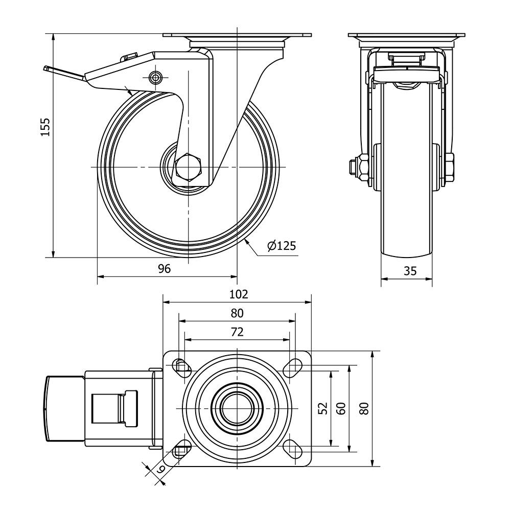 RUEDA GIRATORIA CON PLACA, EJE LISO Y FRENO, COLOR BLANCO, MATERIAL: POLIAMIX, CARGA MÁX. 170 kg, Ø 12,5 cm