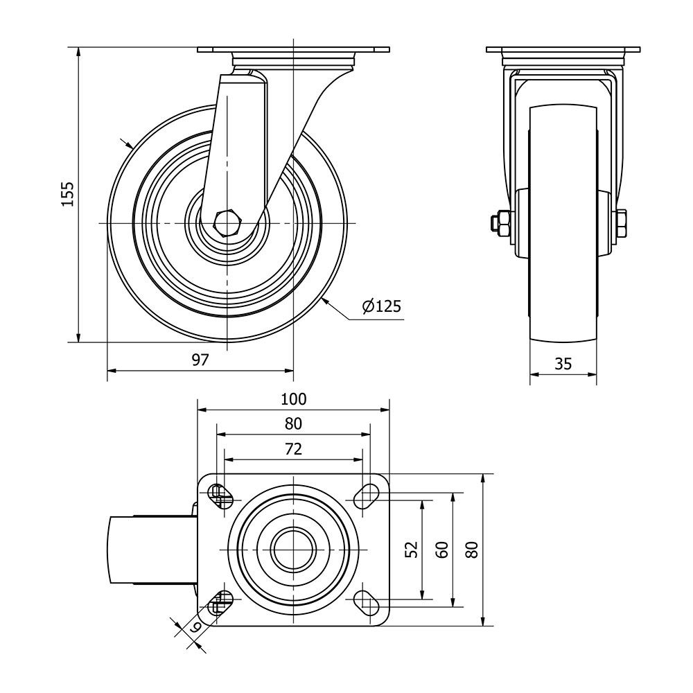 RUEDA GIRATORIA CON PLACA Y EJE DE RODILLOS, COLOR AZUL, MATERIAL: POLIAMIX - GOMA, CARGA MÁX.130 kg, Ø 12,5 cm