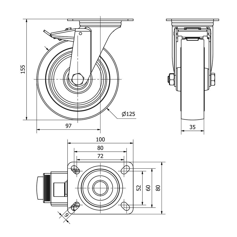RUEDA GIRATORIA CON PLACA, EJE DE RODILLOS Y FRENO, COLOR AZUL, MATERIAL: POLIAMIX - GOMA, CARGA MÁX. 130 kg, Ø 12,5 cm