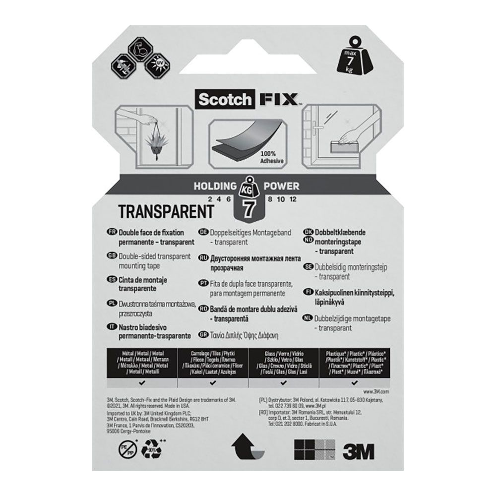 CINTA DOBLE CARA DE MONTAJE, TRANSPARENTE, MÁX 7 Kg, 19 mm x 1,5 m