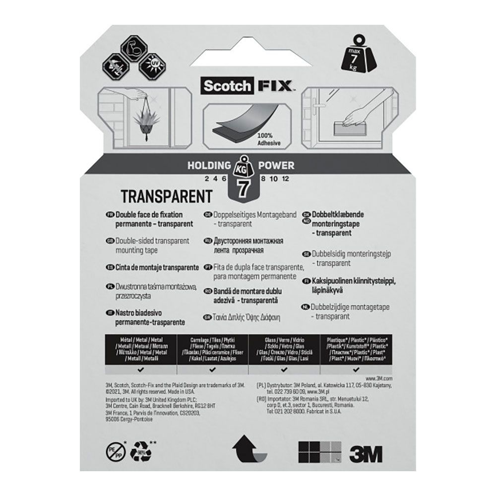 CINTA DOBLE CARA DE MONTAJE, TRANSPARENTE, MÁX 7 Kg, 19 mm x 5 m