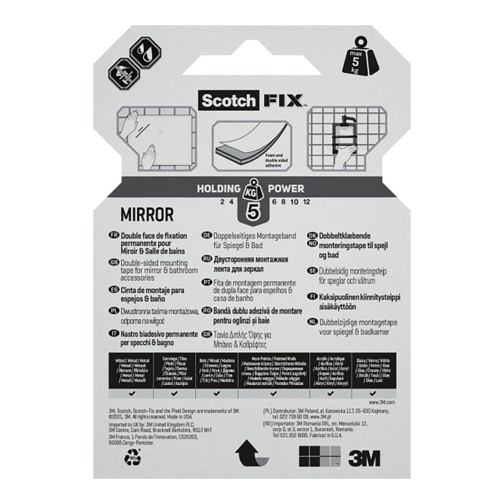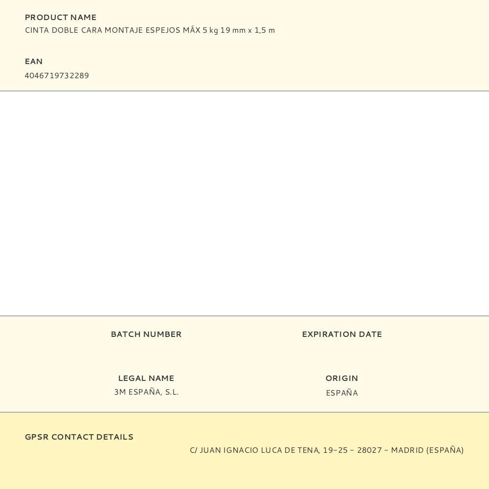 CINTA DOBLE CARA MONTAJE ESPEJOS MÁX 5 kg 19 mm x 1,5 m