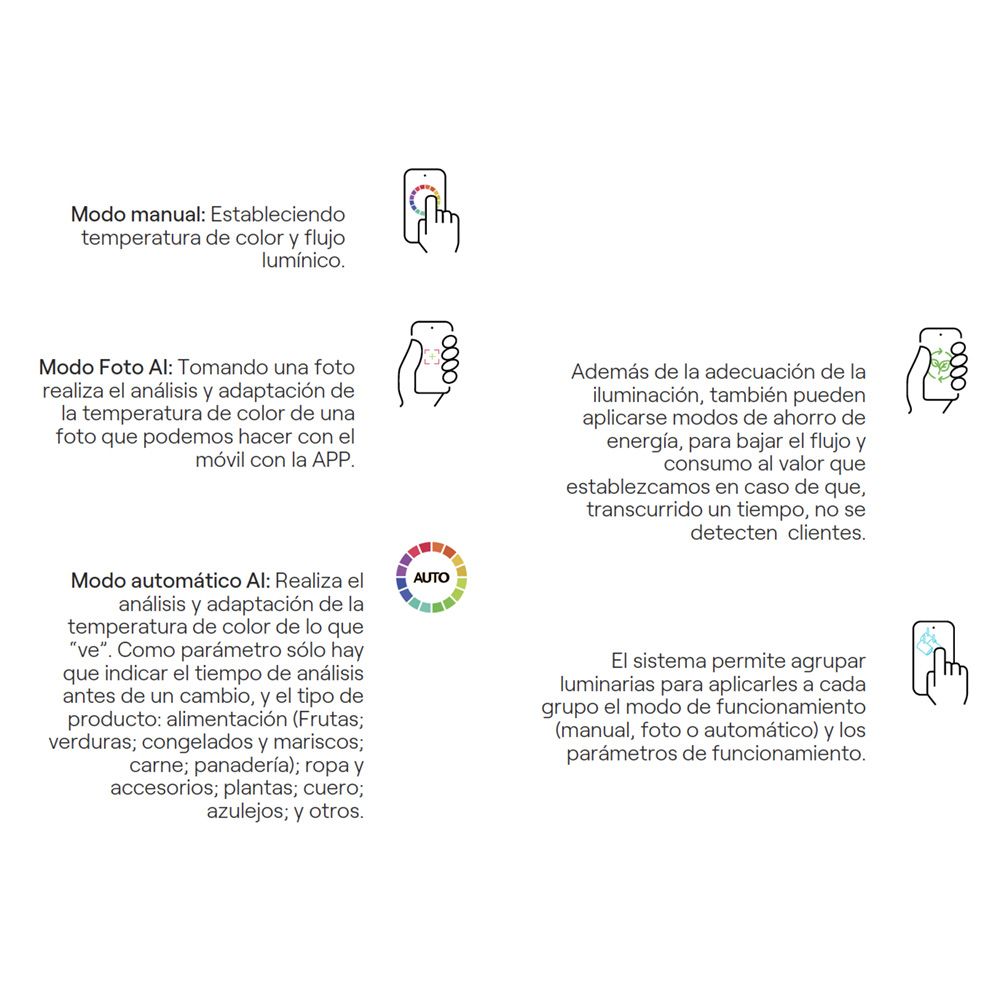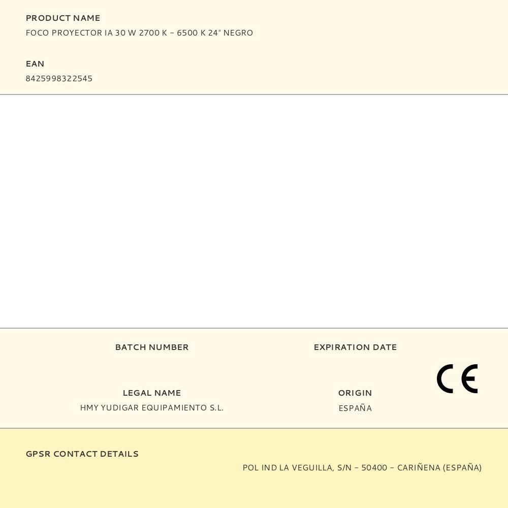 FOCO PROYECTOR, INTELIGENCIA ARTIFICIAL APLICADA A LA ILUMINACIÓN DE TU PROYECTO, 30 W 2700 K - 6500 K 24° NEGRO. IP20 - 220-240 VAC 50 Hz - 170 mA, ROTACION 360°, INCLINACION MAXIMA 90°, INCLUYE SENSOR - CONTROLADO CON EL MOVIL MEDIANTE LA APP CAIMETA, MODO MANUAL MODO FOTO AI Y MODO AUTOMATICO AI, APLICABLE TAMBIEN MODO AHORRO ENERGIA, PERMITE AGRUPAR LUMINARIAS PARA QUE FUNCIONEN DE LA MISMA MANERA