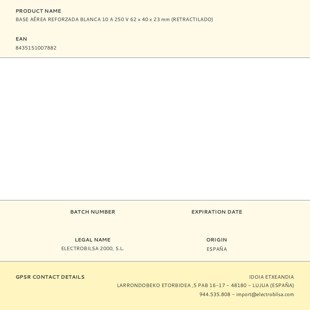 BASE AÉREA REFORZADA BLANCA 10 A 250 V, CON OBTURADOR DE SEGURIDAD, CON POZO, 62 x 40 x 23 mm (RETRACTILADO)