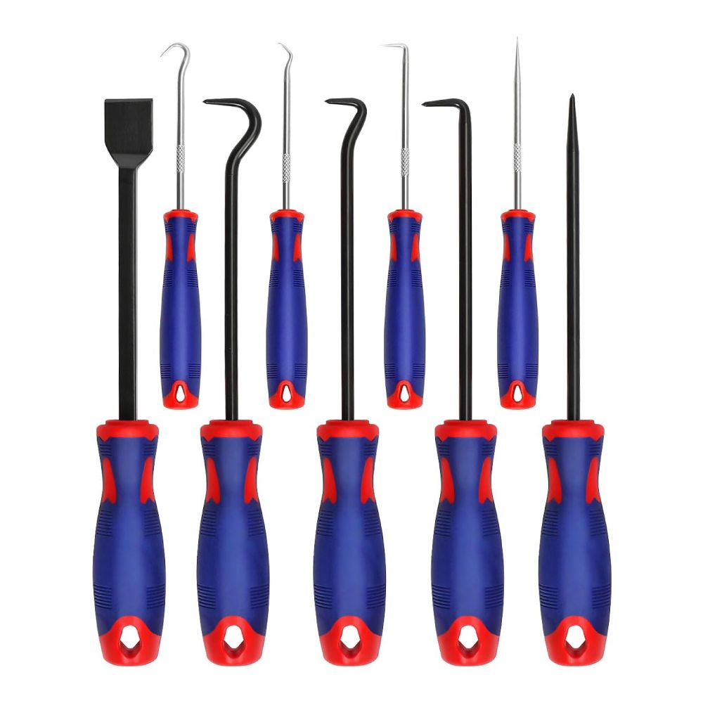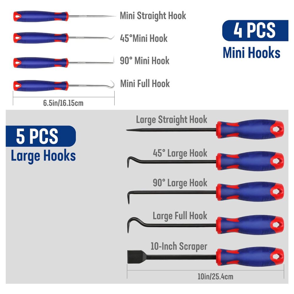 JUEGO DE 9 PIEZAS: 4 MINI GANCHOS Y PUAS DE 16,15 cm, CON MANGOS DE 7,62 cm: 1 RECTO, 1 CURVO, 1 A 45° Y 1 A 90°. 4 GANCHOS Y PÚAS DE 25,4 cm, CON MANGOS DE 15,24 cm: 1 RECTO, 1 CURVO, 1 A 45° Y 1 A 90° - 1 PALA PLANA DE 2,54 cm