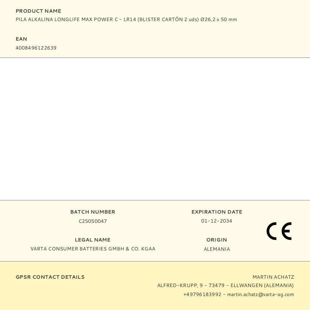 PILA ALKALINA LONGLIFE MAX POWER C - LR14 (BLISTER CARTÓN 2 uds) Ø26,2 x 50 mm