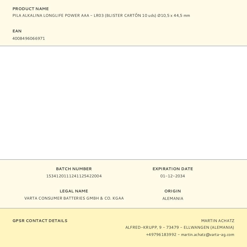 PILA ALKALINA LONGLIFE POWER AAA - LR03 (BLISTER CARTÓN 10 uds) Ø10,5 x 44,5 mm