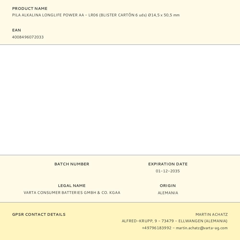 PILA ALKALINA LONGLIFE POWER AA - LR06 BLISTER CARTÓN 6 uds) Ø14,5 x 50,5 mm