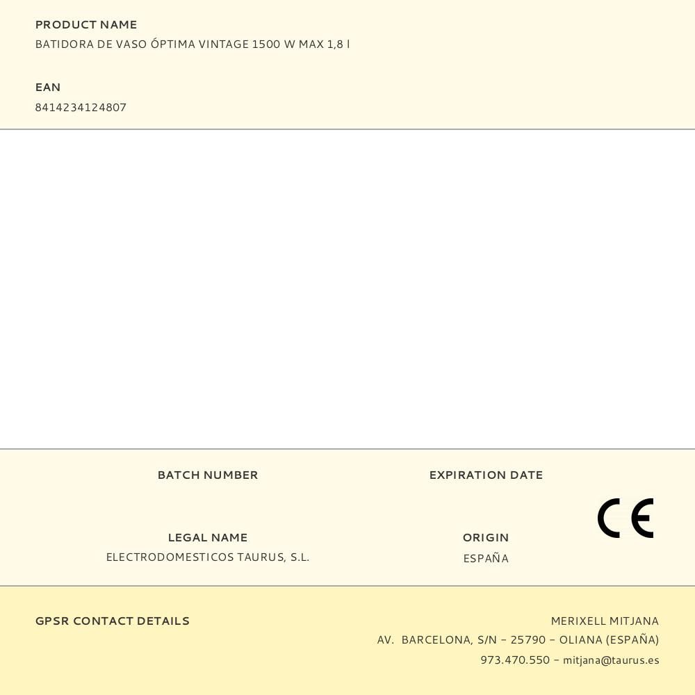 BATIDORA DE VASO ÓPTIMA VINTAGE 1500 W MAX, 21.500 rpm. DISEÑO VINTAGE. JARRA DE CRISTAL GRADUADA DE 1,8 l (CAPACIDAD ÚTIL DE 1,5 l) Y CUCHILLAS DE ACERO INOXIDABLE DE 4 FILOS DESMONTABLE. CON 2 VELOCIDADES + PULSE. SISTEMA DE SEGURIDAD. PIEZAS APTAS PARA LAVAVAJILLAS Y PIES ANTIDESLIZANTES. BOCA DE LLENADO EN LA TAPA Y VASO MEDIDOR BLOQUEABLE DE 30 ml