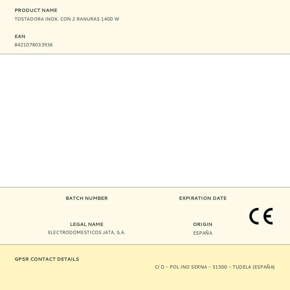 TOSTADOR CON CUERPO EN ACERO INOXIDABLE. DOS RANURAS DE 40 x 255 mm. CENTRADO AUTOMÁTICO DEL PAN. SELECTOR ELECTRÓNICO DE TOSTADO. 5 POSICIONES. 2 FUNCIONES: DESCONGELACIÓN Y MANTENIMIENTO DE CALOR. PULSADOR DE PARADA VOLUNTARIA. BANDEJA RECOGEMIGAS. INDICADORES LUMINOSOS Y RECOGECABLE. VOLTAJE 230 V. POTENCIA MAX. 1.400 W