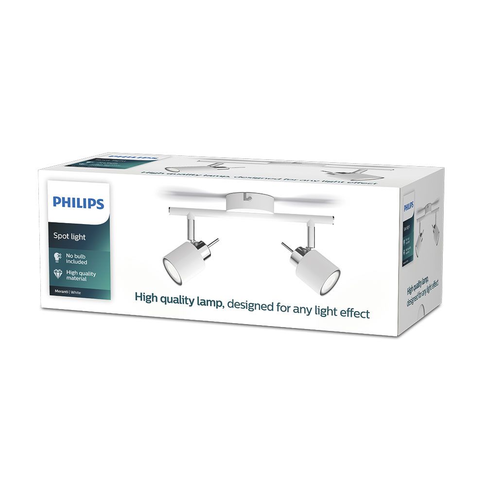 LÁMPARA 2 FOCOS, MERANTI, GU10, BOMBILLAS NO INCLUIDAS, IP20, 220 - 240 V ~ 50 / 60 Hz. CABEZAL DE FOCO AJUSTABLE, MATERIAL: METAL, COLOR BLANCO. DIMENSIONES: Ø8 x 15,5 x 27,4 cm