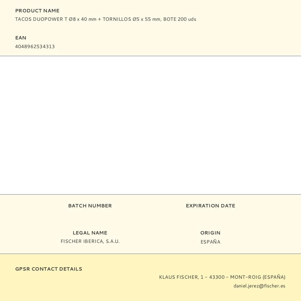 TACOS DUOPOWER T Ø8 x 40 mm + TORNILLOS Ø5 x 55 mm, BOTE 200 uds