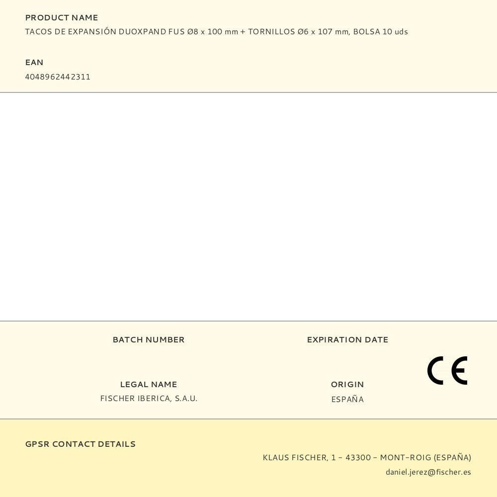 TACOS DE EXPANSIÓN DUOXPAND FUS Ø8 x 100 mm + TORNILLOS Ø6 x 107 mm, BOLSA 10 uds