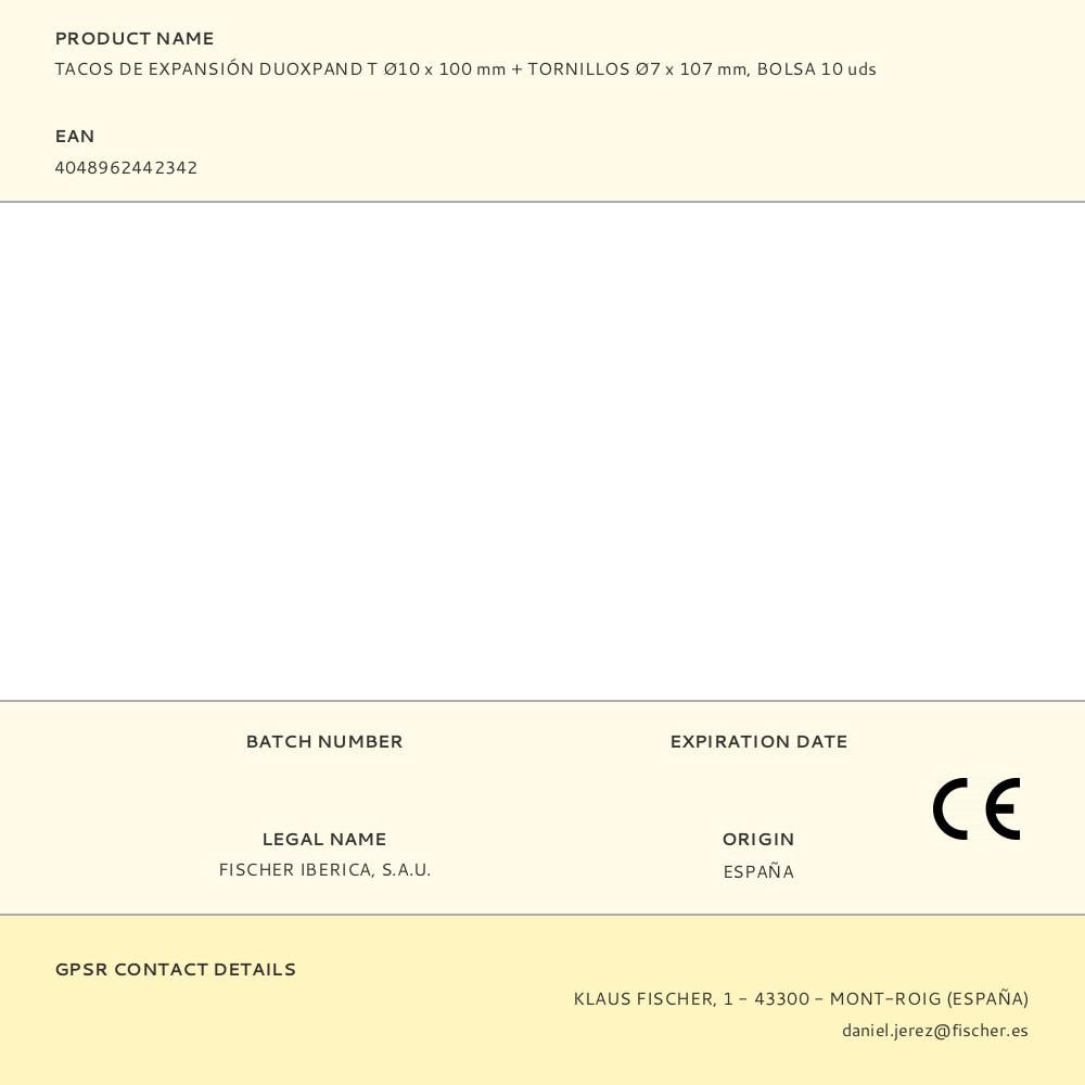 TACOS DE EXPANSIÓN DUOXPAND T Ø10 x 100 mm + TORNILLOS Ø7 x 107 mm, BOLSA 10 uds