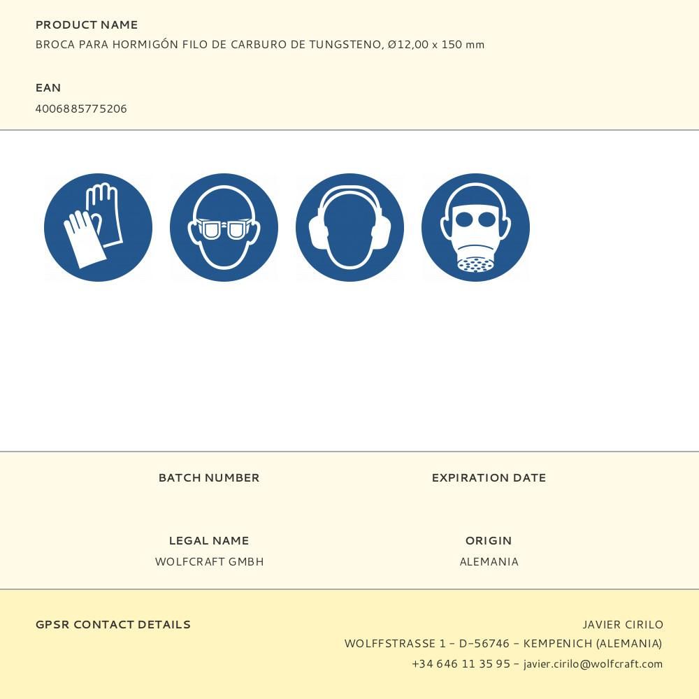 BROCA PARA HORMIGÓN FILO DE CARBURO DE TUNGSTENO, Ø12,00 x 150 mm