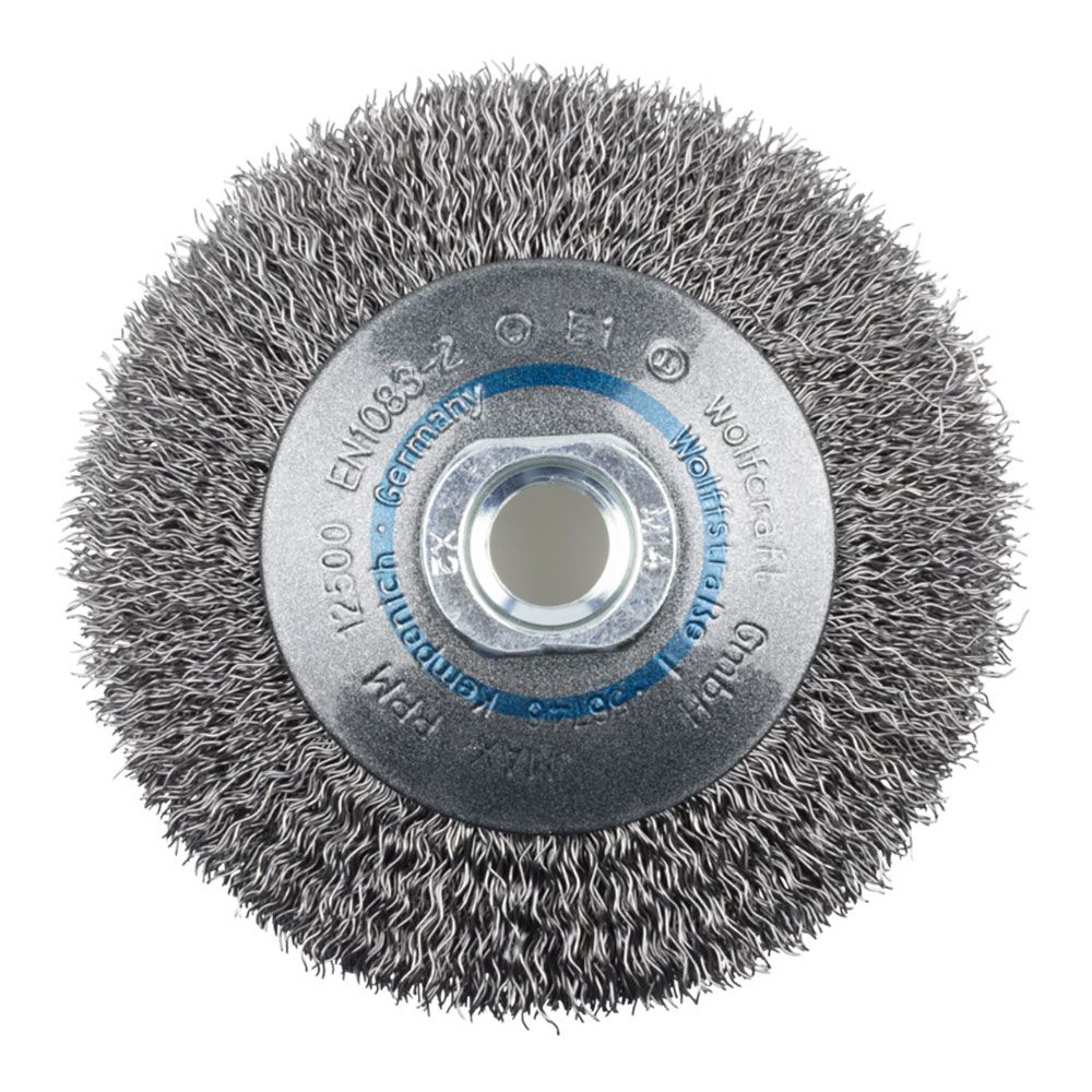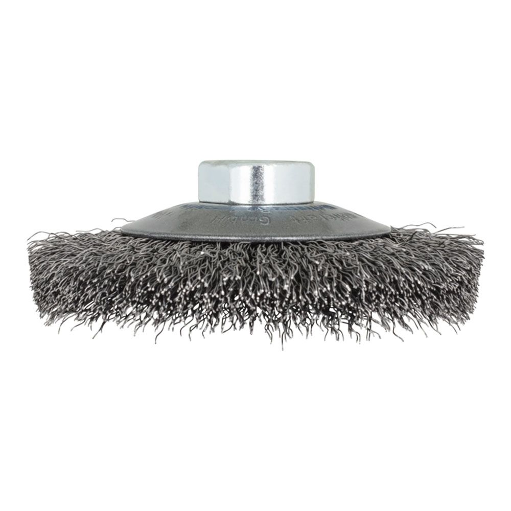 CEPILLO CÓNICO DE ALAMBRE DE ACERO ROSCA M14, Ø100 x 15 mm - VELOCIDAD MÁXIMA DE ROTACIÓN 12.500 RPM