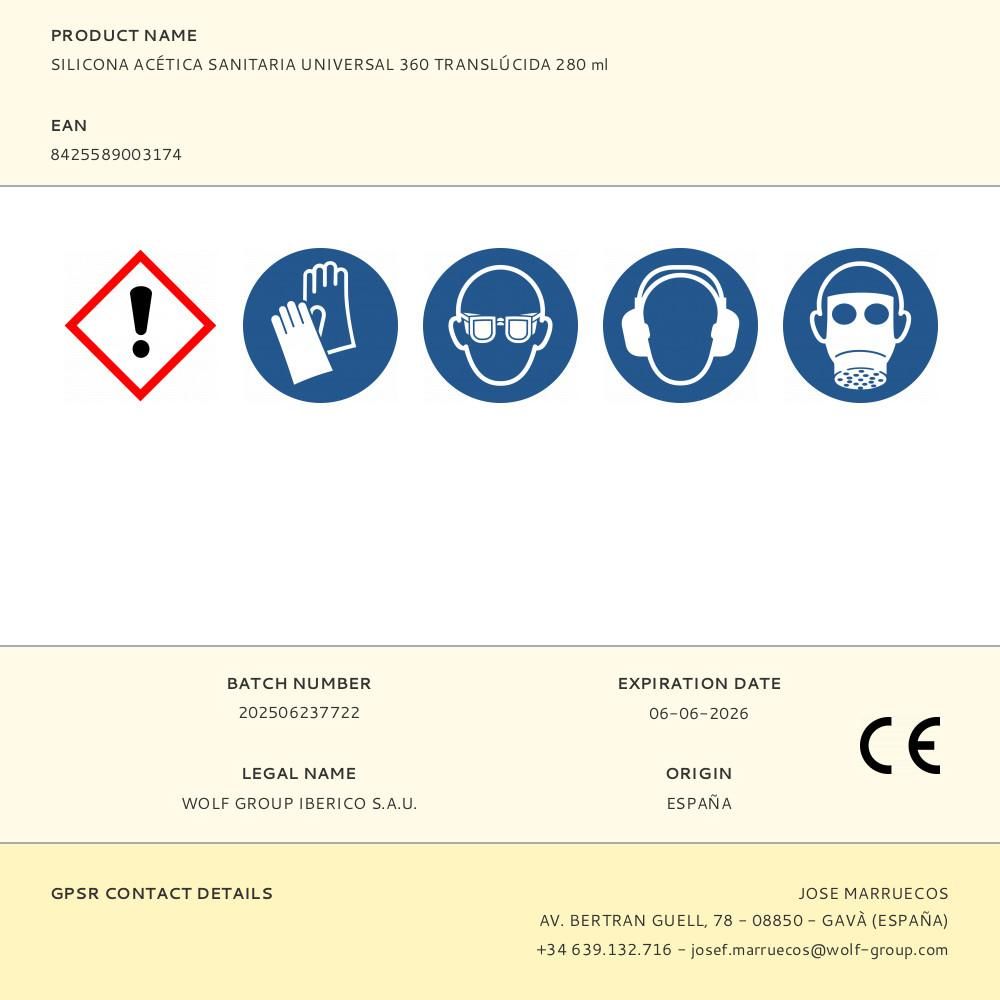 SILICONA ACÉTICA SANITARIA UNIVERSAL 360 TRANSLÚCIDA 280 ml, ANTIMOHO Y ELÁSTICA. PROTECCIÓN FUNGICIDA. GRAN RESISTENCIA A LA RADIACIÓN UVA, CAMBIOS DE TEMPERARTURA Y AL ENVEJECIMIENTO. CURADO RÁPIDO