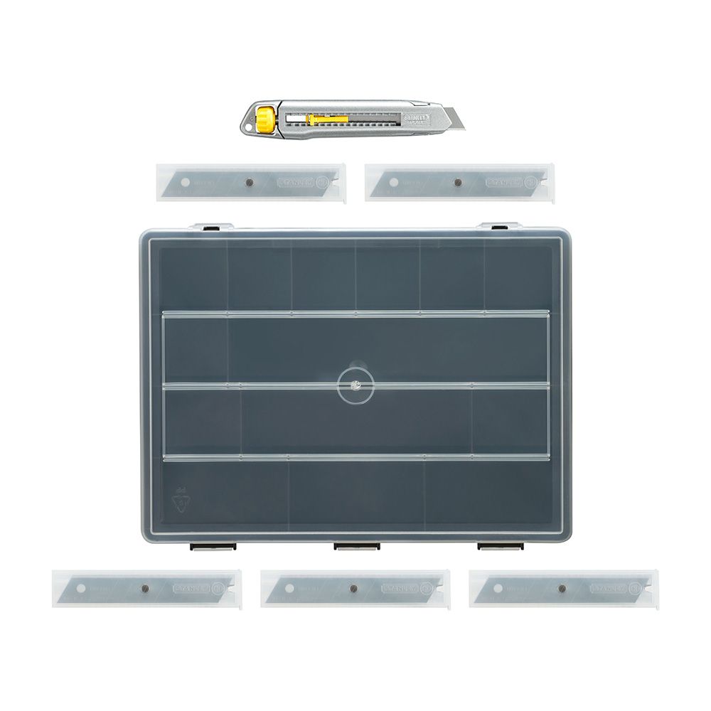 PACK INTERLOCK® CUTTER METÁLICO RETRÁCTIL 18 mm + 50 CUCHILLAS + ORGANIZADOR CON 14 COMPARTIMENTOS Y ASA PARA SU TRANSPORTE, DIMENSIONES 33,5 x 5,6 x 25,5 cm