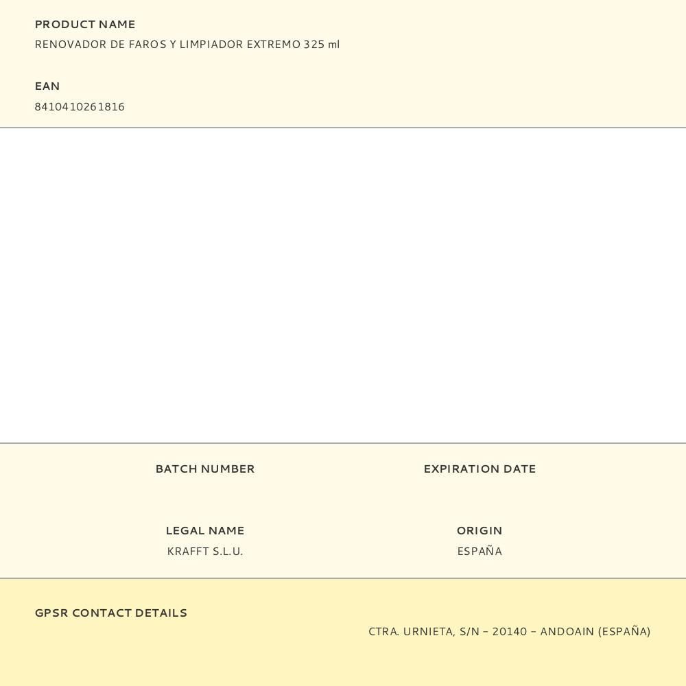 RENUEVA LOS FAROS DEL VEHÍCULO Y ELIMINA FÁCILMENTE LA DECOLORACIÓN DEVOLVIENDO SU APARIENCIA ORIGINAL. VÁLIDO TAMBIÉN COMO LIMPIADOR EXTREMO. CONTIENE 325 ml