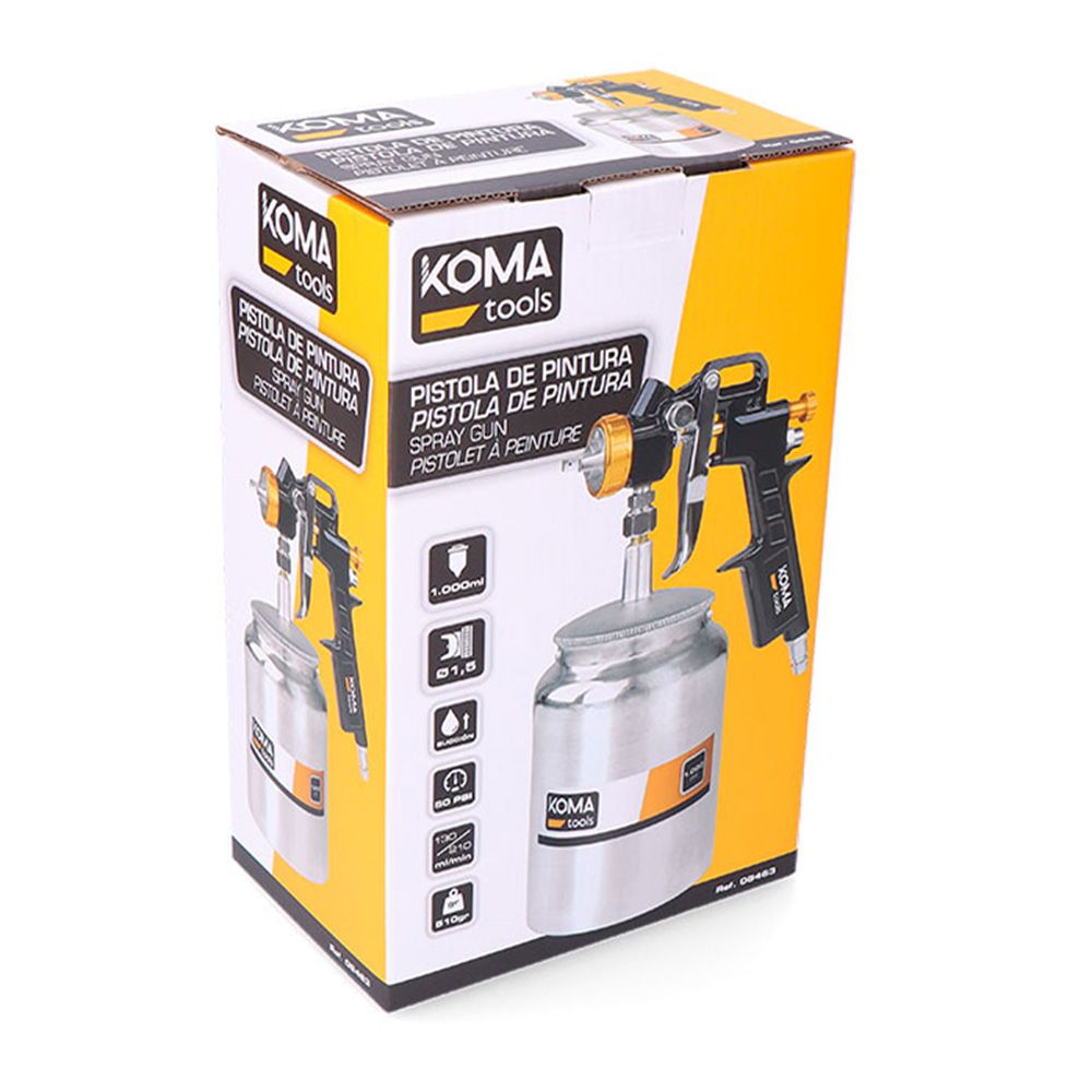 PISTOLA DE PINTURA DE SUCCIÓN, INCLUYE: DEPÓSITO CAPACIDAD DE 1000 ml, LLAVE POLIVALENTE, CEPILLO DE LIMPIEZA. BOQUILLA Ø1,5 mm, ADMITE ENTRE 1,2 Y 2,5 mm. CONSUMO DE AIRE 5-13,5 m³/h, CAUDAL 130 - 210 ml/min, TOMA DE AIRE ¼. PRESIÓN DE TRABAJO 50 PSI. PESO DEL PRODUCTO 510 gr, MEDIDAS: 10,4 x 16,8 x 25,5 cm